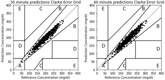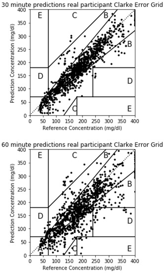Figure 5 captures the results for the Clarke Error Grid for a simulated participant for 30 and 60 min prediction horizons. The majority of the estimations fall in Zone A (clinically accurate zone) for both cases. In the 30 min horizon prediction, from the 739 points in the validation set, 738 fall in Zone A and only one in zone D. In the 60 min horizon case, 729 fall in Zone A, five in Zone B and only one in Zone D. Zone B is clinically acceptable while Zone D represents a failure to detect a hypo or hyperglycemic point in advance.