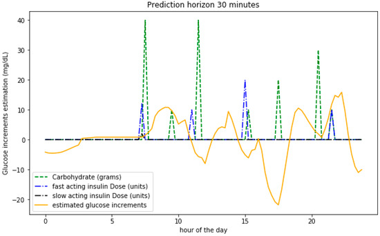 In order to assess how the model is able to learn the underlying metabolic processes, Figure 6 shows the predicted BG level variations on a given day together with the values of the carbohydrate intake and insulin boluses. The food intake increases the BG levels while insulin has the opposite effect. The bigger the input values, the bigger the variations expected.