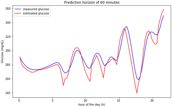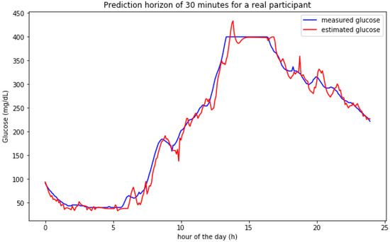 Figure 8 shows the prediction results for a participant in one of the days. The model adjusts both the hypoglycemic episode during the night and the hyperglycemic behavior during the day. The sensor used shows saturation around 400 mg/dL which represents a measurement error in this case. The prediction model tries to assess/predict values higher than 400 mg/dL at the beginning of the saturation window (when the model is fed with accurate data) but adjusts the predictions to the saturated samples for the final part of the glucose peak when the information used for estimating future values is based on saturated data samples.