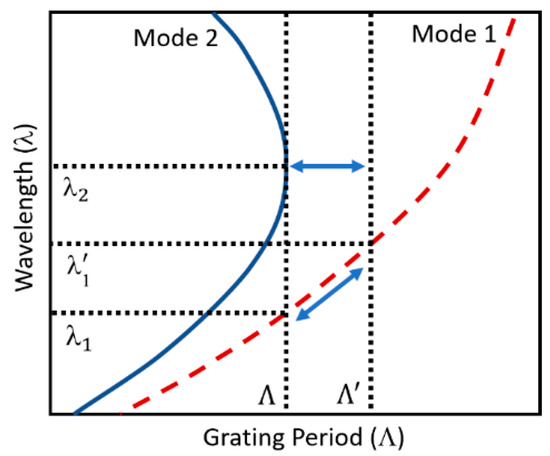 The central wavelengths of the LPFGs attenuation bands are determined through the calculation of the RI of the core and cladding modes. The coupling strength and the form of the LPFGs spectrum are achieved with the calculation of the electric field mode profiles [25]. The effective RI of the propagating core mode of the fiber is generally determined using the weakly guided field approximation [1]. A sketch of the phase-matching curves of mode resonance wavelength against the grating period of an LPFG, is shown in Figure 1.