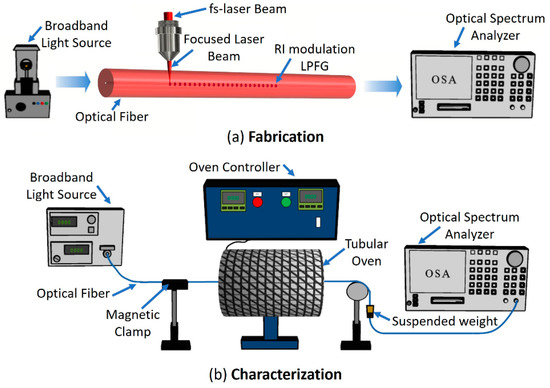 Schematic illustration of the long period fiber gratings (LPFGs): (a) fabrication, and (b) characterization procedures.