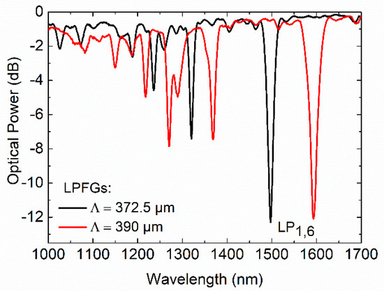 Following the procedures described in the fabrication section, two LPFGs were first fabricated with different RI modulation periods (372.5 and 390 µm), 30.0 and 28.5 mm long, respectively. The transmission spectra are shown in Figure 3.
