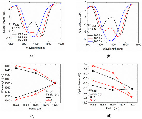 The transmission spectra presented in Figure 5a exhibit two peaks (fiber surrounded by air and under tension) for periods of 182.3 and 182.5 µm. As can be seen in Figure 5b, relaxing the optical fiber increases the separation of the peaks, reaching a separation of 158.50 nm (blue-shift −10.75 nm, and red-shift +12.00 nm) and 113.25 nm (blue-shift −14.25 nm, and red-shift +15.00 nm) for periods of 182.3 and 182.5 µm, respectively. Furthermore, the intensity of both resonances of each LPFG diminishes. It can also be seen that the increase of the inscription period to 182.7 µm causes the two resonance bands in the transmission spectrum to merge into one band, i.e., the 182.7 µm period coincides with the peak of the dispersion curve of the LP1,12 cladding mode. Thus, the LP1,12 cladding mode exhibits a turning point for a wavelength around 1380 nm, as shown in Figure 5c. The optical fiber relaxation with the 182.7 µm TAP LPFG results in a change in the coupling efficiency, but not in the wavelength, as shown in Figure 5c,d. The wavelength and intensity changes of the LPFGs resonance bands with the optical fiber relaxation are associated with the Poisson’s effect (change in transverse dimensions), and to the waveguide contributions, which depend on the slope of the characteristic curve of the resonance band [11].