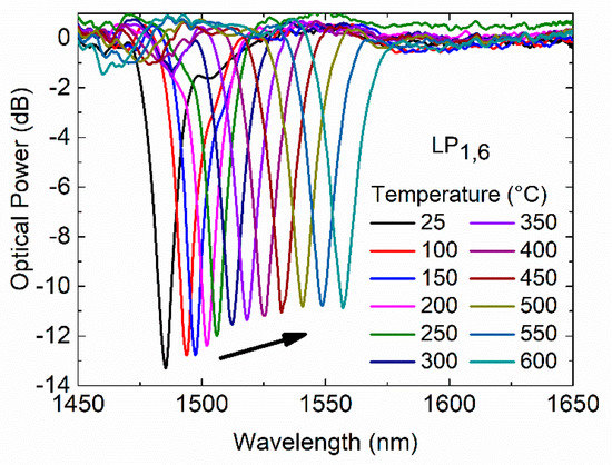 During the annealing procedure, the transmission spectra of the cladding mode LP1,6 of a 372.5 µm LPFG were recorded and are shown in Figure 6.