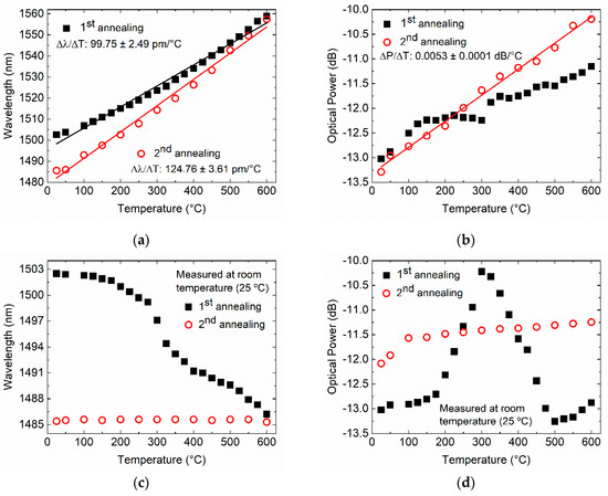 The second annealing shows an improvement of the linearity of the wavelength temperature dependence with 124.76 ± 3.61 pm/°C (and 0.99). Furthermore, the resonance optical power decreases uniformly with the annealing temperature, presenting a temperature dependence of 0.0053 ± 0.0001 dB/°C with linearity 0.99, as shown in Figure 7b. At room temperature (25 °C), the resonance wavelength became essentially constant at 1485.54 nm, regardless of the annealing temperature. Concerning the resonance optical power, we observed a decrease of around 0.52 dB up to 100 °C, followed by a reduction of 0.3 dB up to 600 °C. Thus, with the performed thermal treatment through short-term thermal exposure (5 min at each temperature), it is possible to enhance the fs laser LPFGs thermal stability up to 600 °C. Furthermore, the temperature response presented in this work is higher compared to other high-temperature sensors based on LPFG fabricated in SMF 28 fiber [3,24].