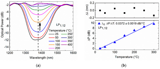 From 25 to 300 °C, the TAP LPFG exhibits a single resonance that is wavelength-independent of temperature, as shown in Figure 8a. Furthermore, it is possible to see that the resonance optical power attenuation decreases (i.e., the coupling strength decreases) with the annealing temperature, leading to the resonance vanishing above the 300 °C. Figure 8b shows a temperature dependence (normalized to the room temperature, 25 °C) of 0.0372 ± 0.0019 dB/°C with linearity of 0.98.