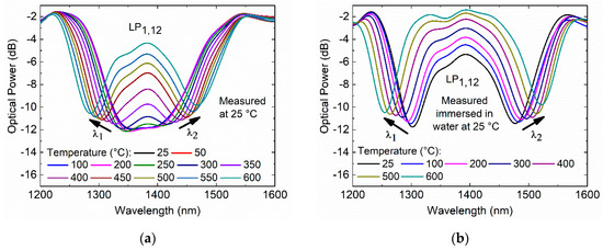 As the annealing temperature increased, the TAP LPFG transmission spectra response was also recorded in air and water at room temperature, as presented in Figure 9a,b, respectively.
