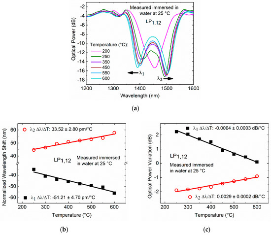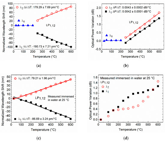 Regarding the TAP LPFG immersed in water at 25 °C, the resonance presents two peaks separated by 175.15 nm (blue-shift −81.24 nm, and red-shift +93.91 nm normalized to the room temperature, 25 °C). As the annealing temperature increase, the two resonances continue to separate, reaching a separation of 266.84 nm (blue-shift −128.48 nm, and red-shift +138.36) in the water at room temperature after an annealing temperature of 600 °C. As shown in Figure 10c, temperature dependences of –86.69 ± 3.24 pm/°C, and 79.21 ± 1.96 pm/°C, with linearity 0.98 and, 0.99 were achieved for the λ1 and λ2 resonances, respectively. Figure 10d shows that the optical power variation, normalized to the room temperature, increases non-linearly. This behavior is related to the waveguide dispersion, which depends upon the order (LP1,12) of the cladding mode and the RI of the medium surrounding the cladding.