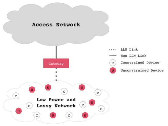 Figure 1 shows a logical representation of a generic wireless sensor network (WSN). A gateway device is required at the edge of the WSN domain to provide Internet connectivity to all of its attached constrained and unconstrained devices. Unconstrained devices usually have more capabilities and access to more reliable power sources.