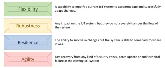 As with conventional networks, the essential security requirements—i.e., confidentiality, authenticity, integrity, accountability and availability—are also mandatory for IoT systems. Availability ensures that the desired network services are available even in the presence of denial-of-service (DoS) attacks. As mentioned in Figure 2, it is important for network administrators and designers to consider this requirement by ensuring flexibility, robustness, resilience and agility capabilities.