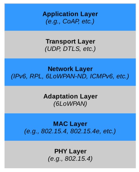 In the following, we will assume that the IoT system is based on IP standards; in particular, IPv6. As shown in Figure 3, the IP protocol stack for IoT systems is largely identical to the “normal” IP stack, with some notable exceptions that can affect the system resilience.