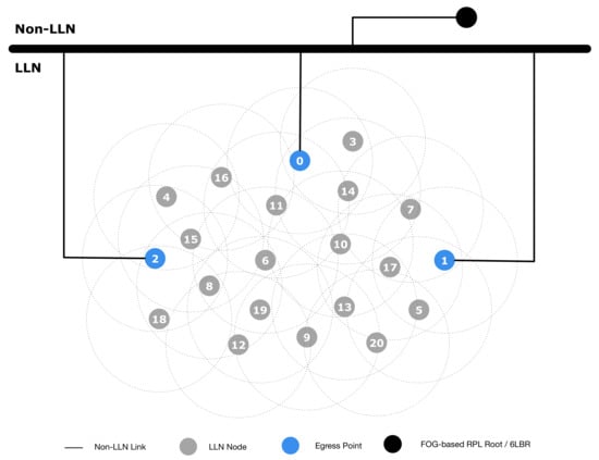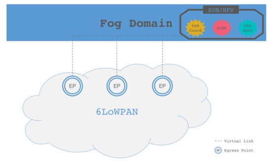 The utilization of IoT devices in our social life and ongoing research work is rapidly increasing, but this work also brings some important challenges. Some of them are required to fulfill the demands of the market, and they need to be addressed in way that strengthens IoT systems in the design process while developing it. All the related standards, IEEE 802.15.4 [2], 6LoWPAN-ND [3,4] and RPL [5], are based on the Tree topology, where the “root” node is responsible for all management services. Beside this, when a single node—i.e., a gateway—becomes a root node for an LLN, then it represent a single point of failure. Keeping in mind this problem, our proposed architecture provides significant scalability and availability by connecting multiple EPs to the Fog domain. The Fog domain also gives the opportunity to fulfill the network and security managements.