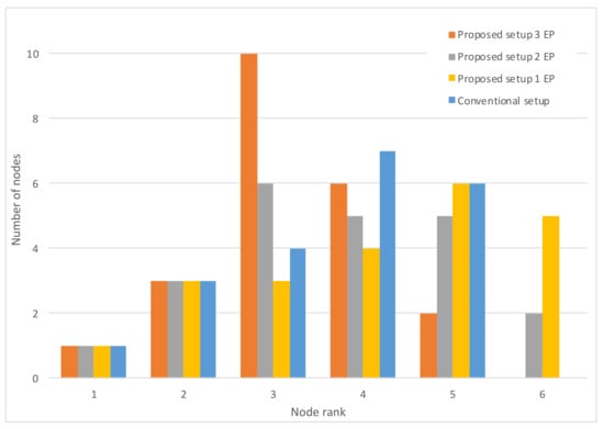 Figure 9 shows the node rank histogram with a varying number of working EPs. It is evident that the introduction of the EP functionality has another benefit on the network, other than increased resiliency: the LLN maximum rank is smaller, with more nodes concentrated on ranks very close to those of the EPs (rank 2 nodes). This has many potential benefits for the network: less energy consumption, less latency, etc.