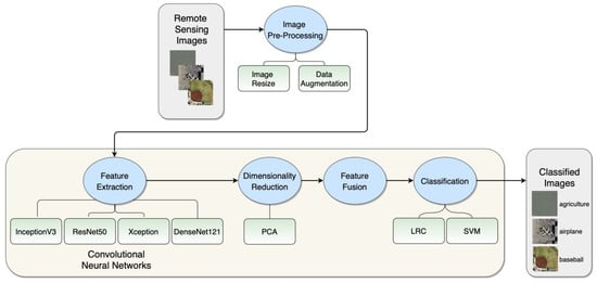 This section of the article briefly describes all pre-trained CNNs used for feature extraction: InceptionV3, ResNet50, Xception, and DenseNet121. These model architectures were used for feature extraction because they exhibited superb performance in image classification on the ImageNet dataset. Following that, we introduce the linear classifiers used for remote sensing images classification: LRC and SVM, as well as the PCA that was used for dimensionality reduction. We observed similar modeling techniques being used in related work [50]. Next, we describe the two publicly available datasets, which were utilized in our study: the UC-Merced and the WHU-RS19 dataset. We use these datasets to evaluate our approaches and compare them with related work. The section is closed with the description of the experimental setup and the evaluation metrics used. The general workflow of the proposed method and its phases are represented in Figure 1.