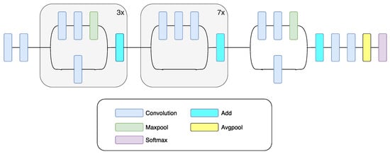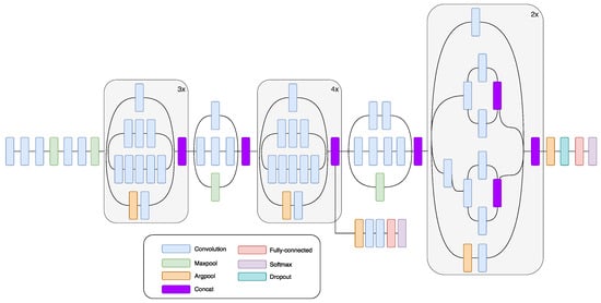 GoogLeNet is a CNN that won the ILSVRC-2014 contest in part for classification and detection tracks. GoogLeNet is a non-sequential CNN. It can increase its depth and width without causing computational strain [43]. GoogLeNet uses the so-called “Inception module.” It comes from the idea that multiple connections between layers lead to redundancy, because of the correlation between them. “Inception module” is a CNN itself. “Inception module” consists of 22 layers and processes its input in a parallel workflow. Within its intermediate layers, several auxiliary classifiers are included. Auxiliary classifiers are inserted to boost the discrimination capability in the lower layers. This module can use convolutional and pooling operations in each layer. For example, in AlexNet and VGG, each level uses either a convolutional or a pooling operation. The main characteristic of the module is that filters with different sizes are used in the same layer. This leads to a different size of the extracted patterns, as well as more exhaustive information. The bottleneck layer, which is a 1 × 1 convolutional layer, has a twofold function: to simplify the computations and to lower the CNN number of parameters. Besides the 1 × 1 convolutional layers, inception modules contain larger kernel convolutional filters, 3 × 3 and 5 × 5. In order to reduce the number of parameters at each level, 1 × 1 convolutional layers precede 3 × 3 and 5 × 5 convolutional layers. After 1 × 1 convolutional layers, ReLU is used, and the goal of this operation is to increase non-linearity and to deepen the network. In this network, there are no fully connected layers; the average pooling layer is used instead. The absence of fully connected layers decreases the number of parameters. The InceptionV3 network has fewer parameters compared to AlexNet and VGG and yet is able to learn deeper presentations of features [48]. Figure 2 shows a diagram of InceptionV3 CNN.