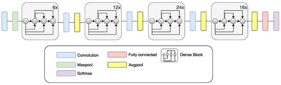 Vanishing of the gradient is a network training problem which is connected with CNN depth. DenseNet, as well as ResNet, fights this problem. The architecture of the DenseNet is based on all layers’ connection, which provides the best information stream between layers [49]. In the DenseNet network structure, each layer receives inputs from all previous layers, and it connects its outputs to every layer ahead. The feature maps at each layer are serially chained to carry on data from previous layers to subsequent layers. Due to the reason that there is no need to learn redundant information, the number of parameters is decreased. All layers are connected, so the DenseNet efficiently preserves the learned information. DenseNet121, a specific implementation of the DenseNet used in this paper, exhibits excellent classification performance when it comes to small training datasets, and is not prone to overfitting [49]. Figure 5 shows a diagram of DenseNet.