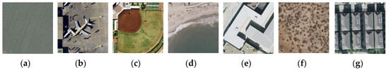 The UC-Merced dataset [21] has 21 classes of aerial scene remote sensing images, as can be seen in Figure 6. The pixel resolution of images is one foot. They are cropped to regions of 256 × 256 pixels. The original images were downloaded from the United States Geological Survey (USGS) National Map of the following US regions: Birmingham, Boston, Buffalo, Columbus, Dallas, Harrisburg, Houston, Jacksonville, Las Vegas, Los Angeles, Miami, Napa, New York, Reno, San Diego, Santa Barbara, Seattle, Tampa, Tucson, and Ventura. Each of the 21 classes has 100 images, which are manually selected and uniformly labeled: agricultural, airplane, baseball diamond, beach, buildings, chaparral, dense residential, forest, freeway, golf course, harbor, intersection, medium-density residential, mobile home park, overpass, parking lot, river, runway, sparse residential, storage tanks, and tennis courts. What makes the dataset difficult for classification is that there are some classes with similar object shapes and distribution, e.g., dense residential, medium residential, and sparse residential. The difference between these classes is mostly in object density.