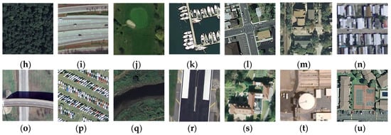 Image classes in UC-Merced dataset: (a) agriculture; (b) airplane; (c) baseball diamond; (d) beach; (e) buildings; (f) chaparral; (g) dense residential; (h) forest; (i) freeway; (j) golf course; (k) harbor; (l) intersection; (m) medium residential; (n) mobile home park; (o) overpass; (p) parking lot; (q) river; (r) runway; (s) sparse residential; (t) storage tanks; and (u) tennis court.