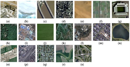 Image classes in WHU-RS dataset: (a) airport; (b) beach; (c) bridge; (d) commercial; (e) desert; (f) farmland; (g) football field; (h) forest; (i) industrial; (j) meadow; (k) mountain; (l) park; (m) parking; (n) pond; (o) port; (p) railway station; (q) residential; (r) river; and (s) viaduct.
