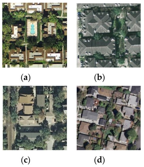Class representatives of the UC Merced LandUse dataset: (a) dense residential; (b) dense residential; (c) medium residential; (d) medium residential.