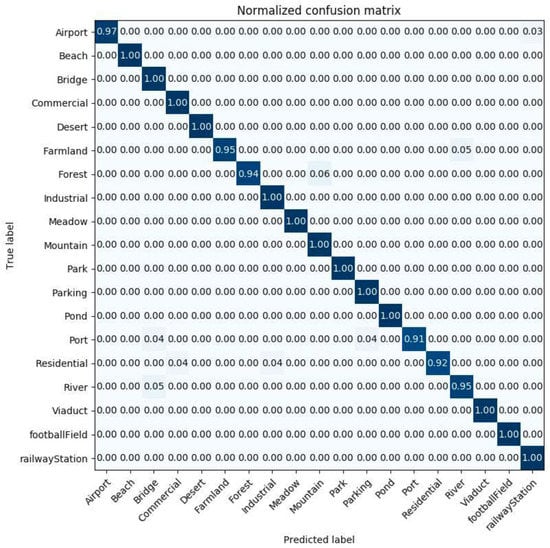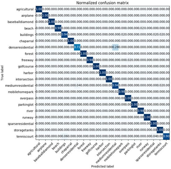 Figure 8 displays the confusion matrix plotted in the case of the best classification accuracy obtained by the InceptionV3 mixed_8 (PCA) + Xception average pooling layer with 50% of the UC-Merced dataset as a training set. The confusion matrix shows that the worst classified categories are ‘dense residential’ and ‘medium residential.’ Those two classes are easily confused with each other. This comes from the fact that the ‘dense residential’ and ‘medium residential’ classes have similar image structures, for example, the building shapes and distribution, and it is difficult to differentiate them from each other, which can be seen in Figure 9. However, it is noticeable that ‘dense residential’, as well as ‘medium residential’, achieved an accuracy of 88%. This accuracy outperformed the GCFs+LOFs [57], with a ‘dense residential’ accuracy of 74%, and the Inception-v3-CapsNet [54], with a ‘dense residential’ accuracy of 80%. These two methods are the best ones ranked in Table 4.