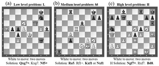 Representation of the three chess-based problem-solving tasks by level of complexity: (a) panel—low level problem (L); (b) panel—medium level problem (M); (c) panel—high level problem (H).