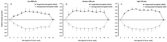 Example of the relative changes in oxygenated hemoglobin and deoxygenated hemoglobin in one participant during the three experimental tasks. Bin 0 marks the baseline and Bin 11 the end of each task. The relative changes were computed as the mean change in the overall optodes. (a) panel—low level problem (L); (b) panel—medium level problem (M); (c) panel—high level problem (H).