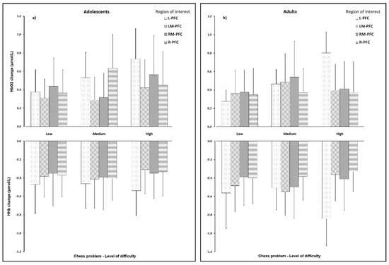 Relative changes in oxygenated hemoglobin (HbO2) and deoxygenated hemoglobin (HHb) in the adolescents group ((a) panel) and in the adults group ((b) panel), according to the level of difficulty of the chess-based problem-solving tasks. L-PFC—left prefrontal cortex; R-PFC—right prefrontal cortex; LM-PFC—left medial prefrontal cortex; RM-PFC—right medial prefrontal cortex.