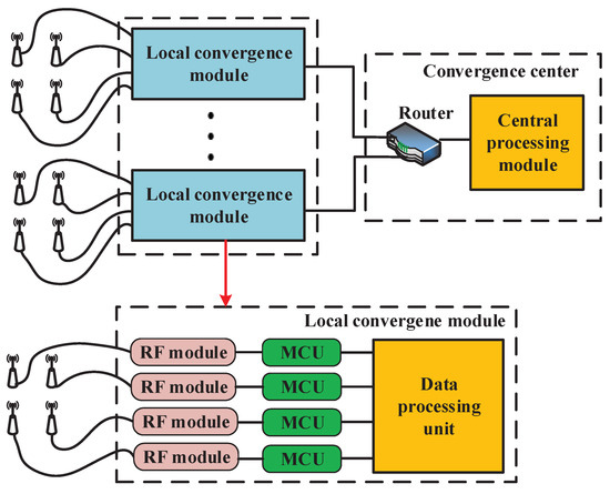 The proposed macrodiversity reception scheme indicates that the sink node is mainly composed of mutiple local convergence modules and a convergence center. Each local convergence module equiped with four antennas is based on the diversity reception scheme to against fast fading. The convergence center connects with multiple local convergence modules via fiber or ethernet and receives packages from every local convergence module. Each local convergence module should be placed at a different location to realize macrodiversity reception scheme. The architecture of the proposed macrodiversity reception system is shown in Figure 2. The local convergence module consists of four RF modules, four lower-power microcontroller units (MCU) and a data processing unit. The RF module configured by MCU receives packages from sensor node. The MCU connects with RF module via serial peripheral interface (SPI) and reads packages received by RF module. The data processing unit should be a low-power microprocessor and connects with MCU through serial port. It buffers and processes the packages received by RF module and sends the data combined to convergence center via optical fiber or ethernet. In the convergence center, a router or switchboard is necessary, which connects with multiple local convergence modules and achieves transmission from multiple local convergence modules to the convergence center. The data processing module connnects with the router or switchboard via ethernet to receive and processes packages from different local convergence modules.