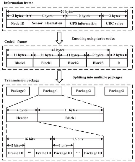 Second, in order to explore the time diversity and to cancel the random noise, the turbo code and the channel interleaver are used for each information frame [31,32]. The code length of the turbo code is 42 bytes with the information part 20 bytes. After encoding, the whole turbo codeword is interleaved in bit level in order to adapt to the transmission schemes with four small packages.