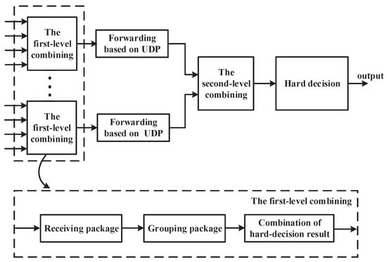 The proposed macrodiversity reception scheme provides a cascaded combing scheme to distribute the computing complexity of the convergence center to each local convergence module, which can effectively reduce the demand for computing resources of sink node. The scheme consists of two diversity combinings. The first-level diversity combining is completed on the local convergence module, and its output is sent to the convergence center based on the user data protocol (UDP) for the second-level diversity combining. The specific process of the cascaded combining scheme is shown in Figure 4.