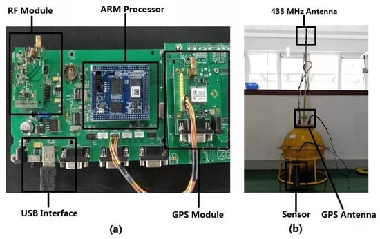 The sensor node in buoy. (a) The hardware structure of sensor node. (b) The maritime communication buoy.