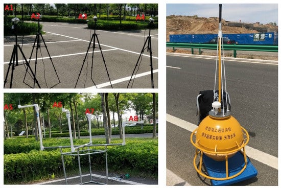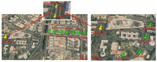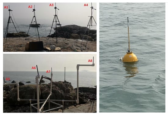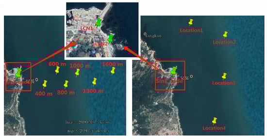 In the third experiment, the sensor node was placed 400, 600, 800, 1000, 1300, and 1600 m offshore for testing. Then, in order to analyze the performance of different antennas placement strategies in the ocean scenarios, we conducted the fourth experiment within a radius of 1100 m. A total of four test locations were selected for the measurement, and the comparison measurement was performed at different locations in the area to be monitored. The experiment tested 3000 frames at each location. The locations of buoys and local convergence nodes in the ocean scenarios are shown in Figure 11. The scene of the sink node and the sensor node in the ocean scenarios are shown in Figure 12. The weather on the day of the experiment was fine, with a southeast wind of levels 3–4.