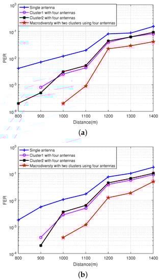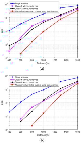 The relationship between performance of macrodiversity reception scheme using different number of antennas and transmission distance. (a) The relationship between PER of macrodiversity reception scheme using different number of antennas and transmission distance. (b) The relationship between FER of macrodiversity reception scheme using different number of antennas and transmission distance.