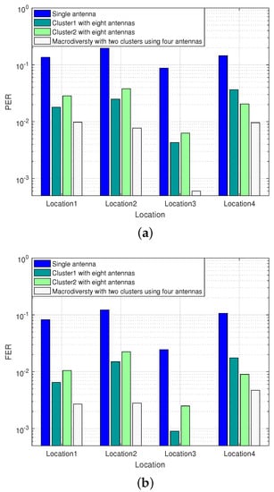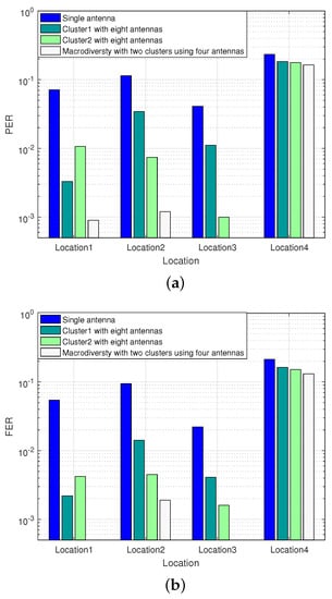 It can be seen from Figure 14 that the macrodiversity reception scheme with two clusters can achieve higher reliability transmission (PER < ) compared with single cluster reception scheme within the transmission distance of 1100 m. When the sensor node is located in Location1 and Location4, the paths from the sensor node to the two local convergence nodes are approximately in a straight line, and the received signals are highly correlated. Under the circumstances, the transmission gain of the macrodiversity reception scheme is close to that of single cluster reception scheme. When the sensor node is located in Location3, the paths from the sensor node to the two local convergence nodes are quite different, and the correlation of signals in the two local convergence nodes is also weak. At this location, the FER of single cluster reception scheme using eight antennas scheme at LCN1 and LCN2 are and respectively, while the macrodiversity reception scheme can achieve error-free transmission.