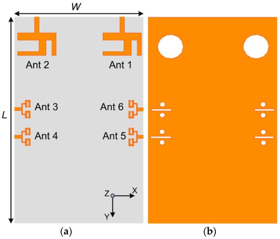 Geometry of the Integrated LTE (Long Term Evolution) and 5G MIMO (multiple-input multiple-output) Antenna System: (a) Top View; (b) Back View (Dimensions are in millimeter).