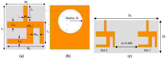 where, εreff is the effective permittivity, and Ws and H are the width and height of the substrate. Thus, an optimized Y-shaped antenna is obtained after the parametric analysis. Moreover, Figure 2b depicts that a circular slot of radius, R1, is loaded at the bottom layer as DGS to vary the current density at the ground, which leads to improved radiation performance. The dimensions of the optimized antenna are tabulated in Table 1. Afterwards, the single-element antenna is proceeded to a two-element MIMO configuration with substrate dimensions of 75 mm × 25 mm × 0.76 mm, as shown in Figure 2c. The two MIMO elements Ant1 and Ant2 are separated by a distance d1 approximately equal to 0.46λ at 5.9 GHz.