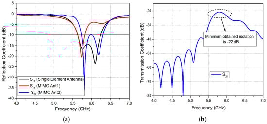 The performance of the LTE single patch antenna as well as the MIMO array is investigated through the reflection coefficient and transmission coefficient curves, as shown in Figure 3a,b, respectively. It is clear from the S11 curve that the single-element LTE antenna is covering the desired LTE-band (47) and part of LTE-band 46, ranging from 5.62 to 6.25 GHz with a sufficient operating bandwidth of 630 MHz. Also, the S11 and S22 plots demonstrate that both MIMO elements Ant1 and Ant2 are resonating for the frequency bands 5.63–5.85 GHz and 5.72–5.97 GHz, respectively. A slight band shift is observed for the two elements. In addition, analysis of the S-parameter curves demonstrates that the obtained bandwidth of the operating band for the MIMO configuration has been reduced to 250 MHz as compared to the single-element antenna, due to coupling between the two elements. Furthermore, the transmission coefficient curves in Figure 3b elucidate that a minimum isolation of 22 dB is achieved amid the two MIMO antennas for the entire operating band.