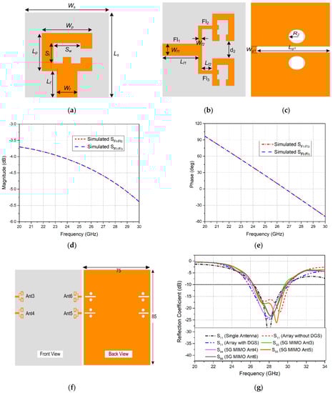 Geometry of 5G antennas: (a) Single Patch Antenna; (b) 5G Antenna Array, Front View; (c) 5G Antenna Array, Back View; (d) Simulated Transmission coefficient magnitude curves of the feed network; (e) Simulated Transmission coefficient phase curves of the feed network; (f) 5G MIMO Design; (g) Simulated Reflection Coefficient Curves for 5G Antenna.