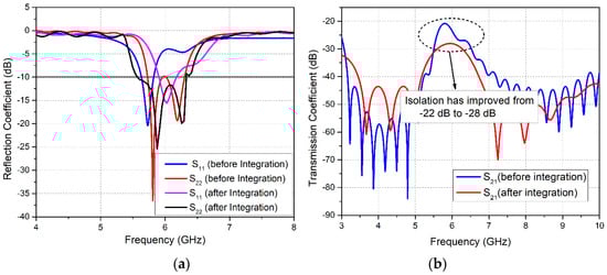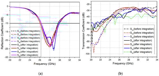 Simulated S-parameter Curves for 5G MIMO Antennas Before and After Integration (a) Reflection Coefficient; (b) Transmission Coefficient.