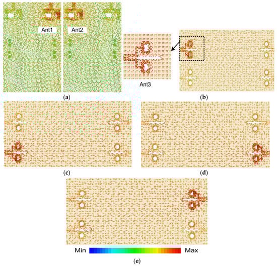 Surface Current Distribution for: (a) LTE MIMO Antennas at 5.9 GHz; (b) 5G Ant3; (c) 5G Ant4; (d) 5G Ant5; (e) 5G Ant6 (For all 5G Antennas current distribution is investigated at 28 GHz).