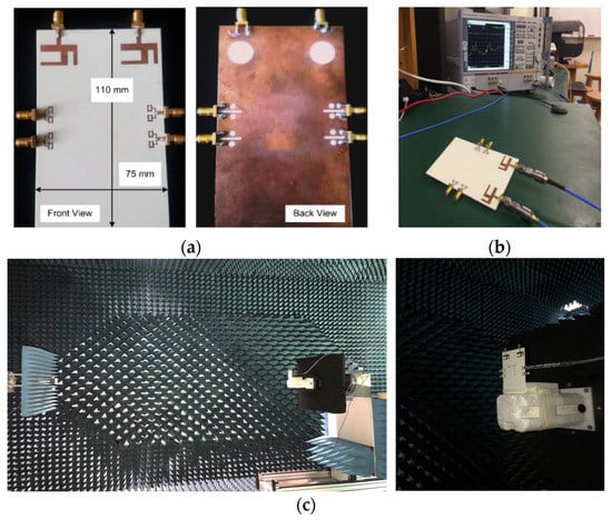 The proposed integrated MIMO antenna prototype was manufactured on a Rogers RO4350B substrate using the photolithography process, so that the concept could be demonstrated experimentally. Figure 8a–c depict the fabricated prototype, the S-parameters measurement setup, and the setup for the far-field measurements, respectively. The experimental results manifesting the antennas performance are discussed below.
