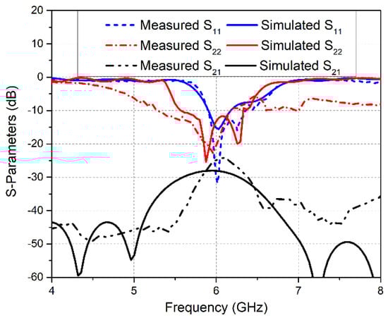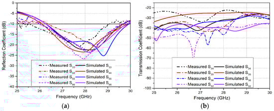 In the same manner, measured and simulated S-parameter results for the mm-wave 5G MIMO antennas are shown in Figure 10a,b. The analysis of simulated and measured reflection coefficient plots (S33, S44, S55, and S66) for Ant3–Ant6 shows band shifts. However, the 5G MIMO antenna system acquires a sufficient measured bandwidth of 3.5 GHz, covering the potential 26/28 GHz mm-wave frequency band, as illustrated in Figure 10a. Furthermore, the measured transmission coefficient plots for the 5G MIMO antennas in Figure 10b demonstrate a minimum isolation of 22 dB between Ant3 and Ant4, as evident from the S34 curve. Hence, good coherence is realized between the simulated and measured results. However, minor inconsistencies occur due to errors in fabrication as well as the unavoidable use of coaxial cables during the measurement of the antenna [43,44].