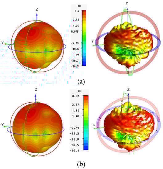 The 3-dimensional (3-D) radiation patterns of the proposed LTE MIMO antennas were obtained through the commercial ORBIT/FR far-field measurement system in a shielded RF anechoic chamber, as depicted in Figure 8c. The simulated and measured radiation patterns for Ant1 and Ant2 were obtained at 5.9 GHz, as illustrated in Figure 11a,b respectively. It was observed that the maxima of the Ant1 is tilted with respect to Ant2, demonstrating reduced field correlation, which is required for MIMO operation.