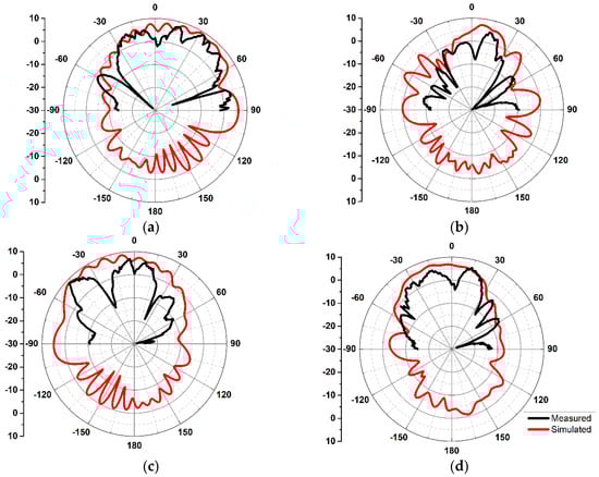 The 2D radiation patterns for the mm-wave MIMO antennas are depicted in Figure 12a–d. The horn antenna utilized for transmission was an SGH-series horn (SGH-15) by Millitech Co., with 24 dBi standard gain. The far-filed patterns are measured at 28 GHz for theta values in the range from −90° to 90°. The radiation patterns for 5G Ant3 in xz and yz plane are illustrated in Figure 12a,b respectively. The beam maximum was detected at +32° for Ant3 in xz plane. Similarly, 2D radiation patterns for Ant6 exhibit maximum radiation at −45°, as depicted in Figure 12c. The obtained far-field results for the proposed MIMO antennas demonstrate different radiation patterns, which is desirable for MIMO applications.