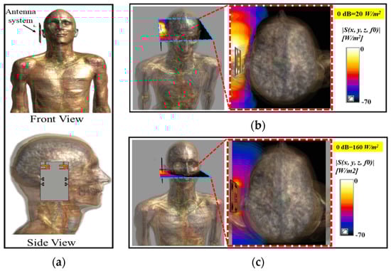 Mobile devices work in close proximity to the human body; their antenna systems radiate and receive high-frequency electromagnetic waves (EM). Excessive absorption of EM radiation by human tissue is harmful, and produces ionization and heating effects. To guarantee human safety, excessive exposure of human tissues to EM radiations is standardizedby the International Commission on Non-Ionizing Radiation Protection (ICNIRP), the Institute of Electrical and Electronics Engineers (IEEE), and the Federal Communication Commission (FCC). According to IEEE, FCC, and ICNIRP regulations, at lower frequencies (up to 3 GHz, 6 GHz, and 10 GHz, respectively), human exposure is evaluated in terms of Specific Absorption Rate (SAR); however, higher frequency EM waves (above 3 GHz) have very short wavelengths and cannot penetrate deep into human tissues. The higher frequency EM waves are concentrated at the skin and can hardly breach the skin and reach the deep tissues. Hence, at higher frequencies, human safety is evaluated in terms of Spatial Power Density (SPD) instead of SAR [45]. The human exposure in terms of spatial power density for above 3 GHz, 10 GHz, and 6 GHz is limited to 10 W/m2 by IEEE, ICNIRP, and FCC, respectively, as provided in Table 3. The proposed antennas were analyzed in terms of SAR and SPD at the lower frequency band (5.9 GHz) and SPD only at the mm-Wave frequency band (28 GHz). The proposed antenna system was analyzed for human exposure assessment by mounting the antenna system on the head of a realistic Duke human model, as depicted in Figure 13. The distance between the ear and the antenna system was kept as 3 mm, and each antenna element was given a 1 W input power. Figure 13a shows the front and side views of the numerical setup for the exposure assessment of the proposed antenna system. Figure 13b,c depict spatial power density distributions at 5.9 GHz and 28 GHz, respectively. The peak PD values in Figure 13 were 20 W/m2 and 160 W/m2 at 5.9 GHz and 28 GHz, respectively.
