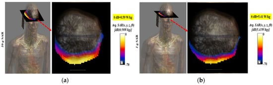 Specific Absorption Rate (SAR) at 5.9 GHz over: (a) 1 g; (b) 10 g standards.