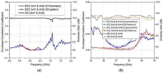 ECC and Diversity Gain for (a) LTE MIMO Antennas; (b) 5G MIMO Antennas.