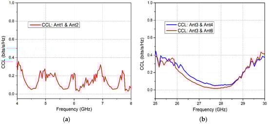 Channel Capacity Loss (CCL) for (a) LTE MIMO Antennas; (b) 5G MIMO Antennas.