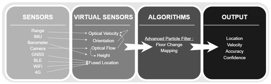 The general structure of the indoor positioning system () is composed of four layers: sensors (physical, smartphone based); virtual sensors, which can be thought of as dedicated-purpose conceptual sensors based on sensor fusion; algorithms (positioning, state estimation, mapping); and output, the last layer, required for continuance positioning (1–30 Hz), as well as for accuracy, confidence estimation, and event-based reporting, such as floor change.